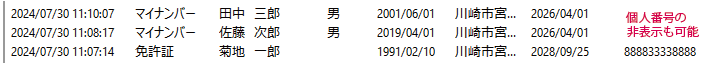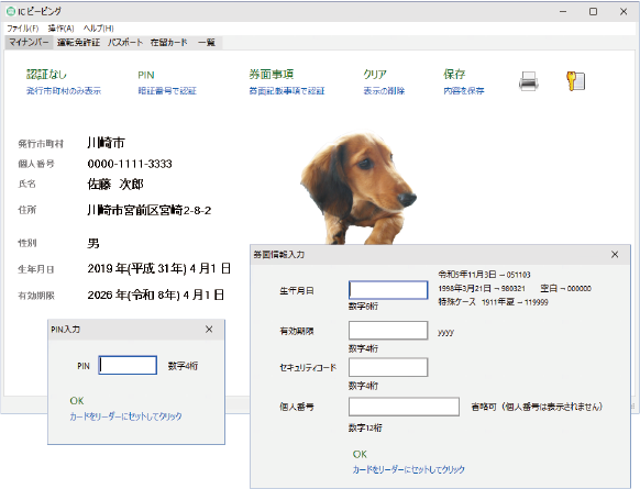 PINコード認証では氏名、生年月日、住所、顔写真、個人番号(非表示の選択あり)を表示