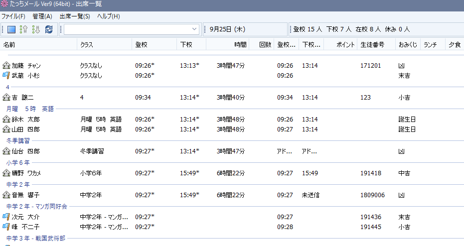 出席記録、生徒情報、入金記録、ポイント記録などをCSVファイルに出力できます