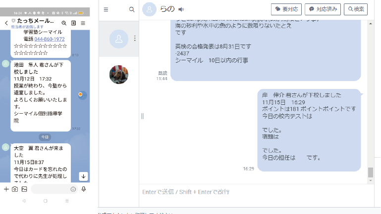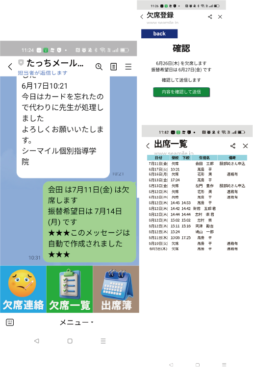 また、入金連絡(授業料を受け取りました)、出席簿、請求書、資格試験申込など、保護者宛のこまかい連絡をメールで送ることが可能です。