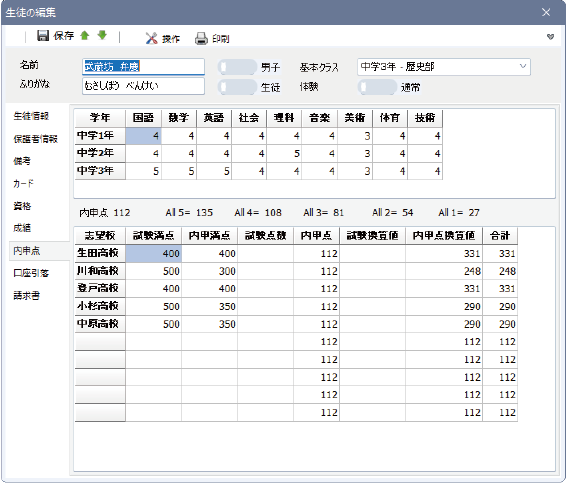 中間、期末テストの結果を記録できます。 2学期制、3学期制、両方の学校があった場合でも学校ごとに設定が可能です。 結果をグラフにして印刷することもできます。