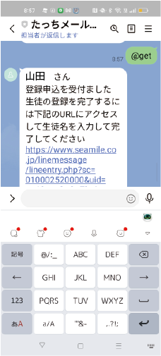 教室のLINE公式チャンネルに友だち登録します 2人まで登録できます、2人登録する場合は同じチャンネルから登録してください トークに「@get」を送信します 生徒登録用URLをクリックしてフォームを表示します 生徒名とふりがなを入力して申込ボタンをクリックします