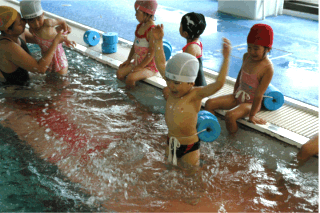 先生がいれば怖くないよ 先生と手をつないで、プールへジャンプ。 上手にできたかな |