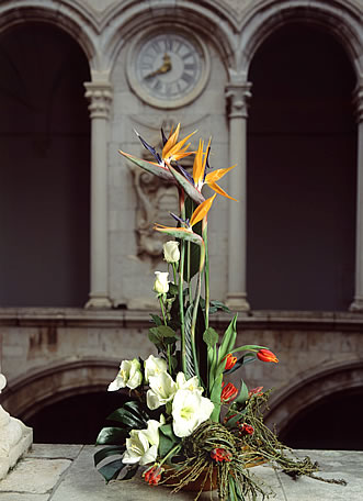 「クロアチアには花市場がないので、オランダから花材を空輸。資材は日本から持ち込みました。花材は希望の半分くらいしか手に入らなかったうえ、オランダから送られてきた荷物をあけてみてビックリ。背の高いものを頼んだつもりが低かったたり、ちょっと頼んだはずがたくさん入っていたりと、ハプニングの連続でした。この続きはオフィシャルHPをご覧ください