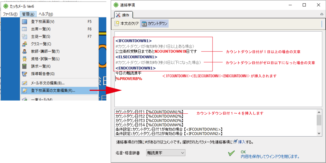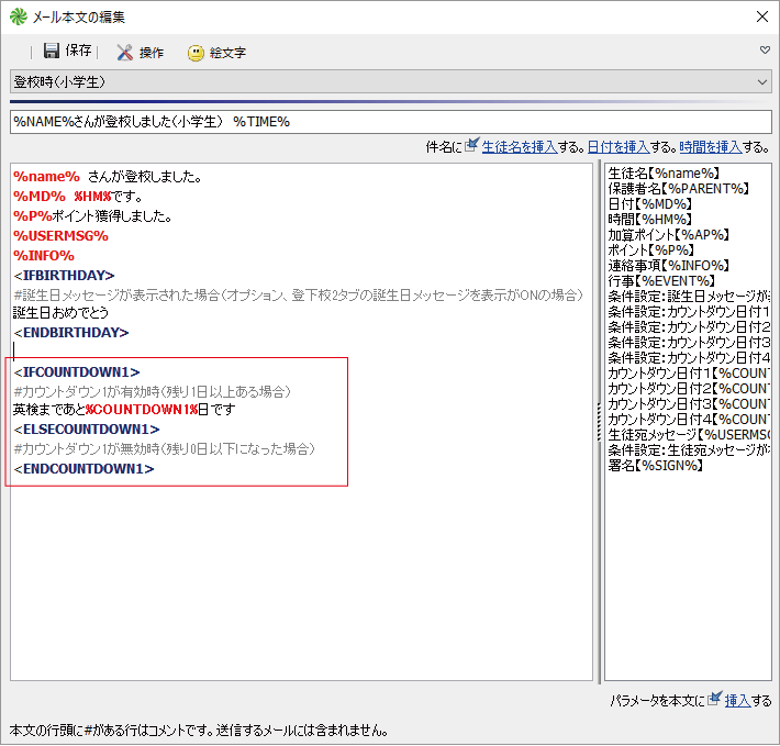登下校画面の文章編集を開きます。 カウントダウン1~4を挿入します。~の間にカウントダウンが有効(1日以上ある)の場合の文章を記入します。 ~の間にはカウントダウンが過ぎた場合の文章を記入します。