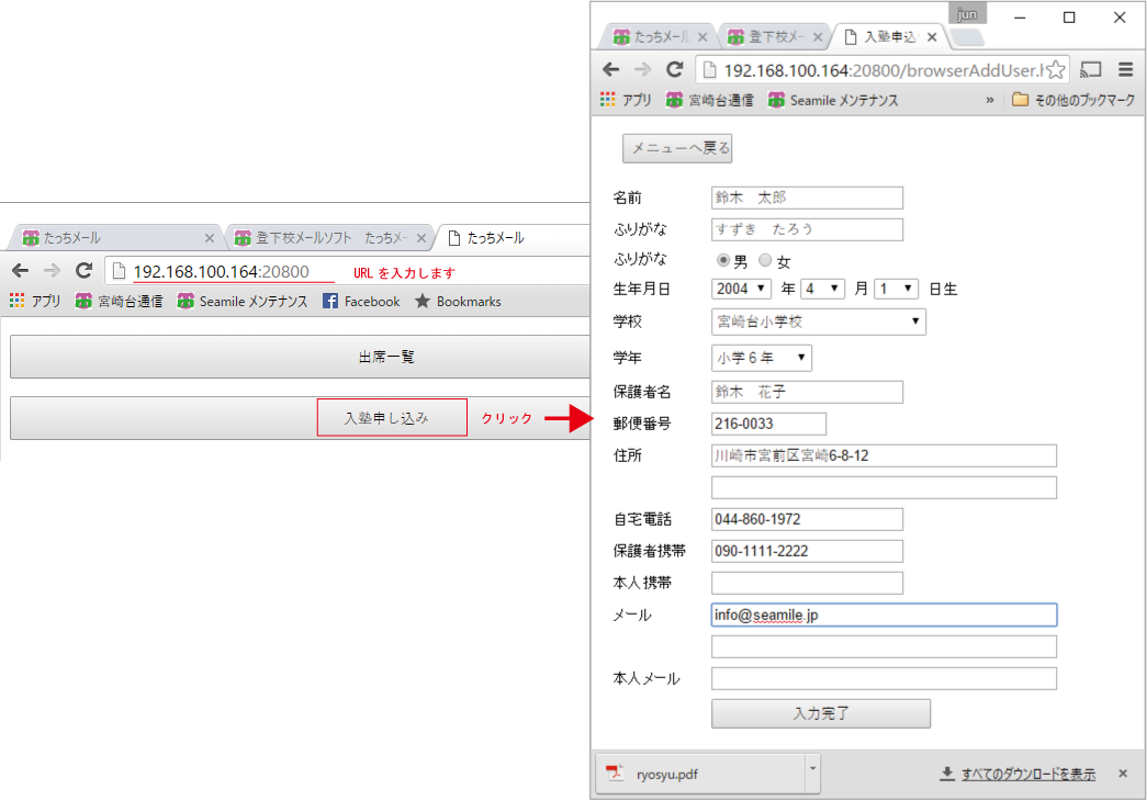 入塾申し込みを教室内のPCのブラウザから入力してもらうことができます。 申込書の印刷が可能です。申し込み内容はたっちメールに反映されます。 この操作は教室内のLANで接続されたPCでのみ使えます。インターネットから申し込みの場合はこちらをご覧ください。