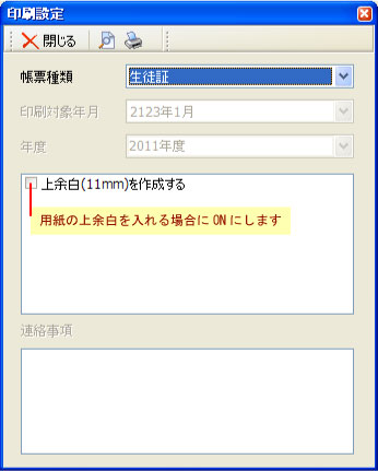 | 帳票種類 − 印刷物の種類を選択します 印刷対象年月、年度 − 対象とする期間を選択します オプション − 印刷オプションを選択します 連絡事項 − 出席簿の下に連絡事項を表示します |